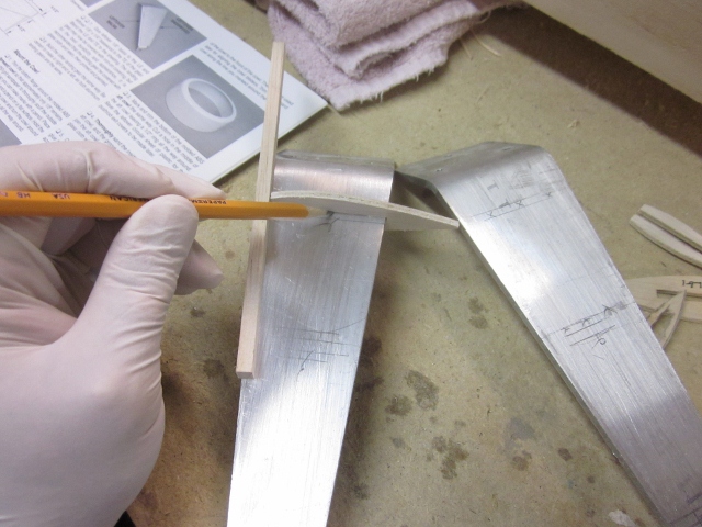 First I have some catching up to do. A while back I bolted the aluminum alloy landing gear legs  in place. Following that the instructions call for adding the LG fairing structure, which consists of three die-cut plywood formers on each side as well as a wrap-around covering of 1/64" plywood. Here I'm marking the exact location of former LG-1 on the left strut prior to using 30-minute epoxy to fix it in place.